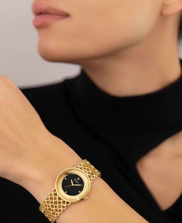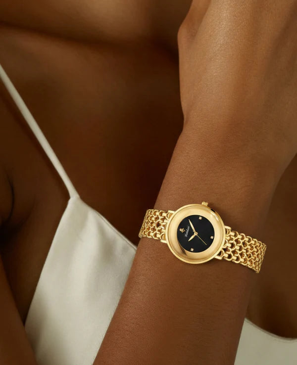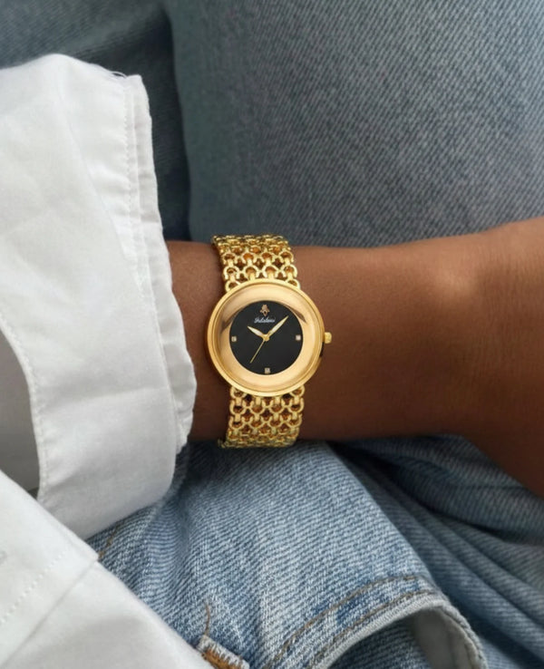 Elevate your look with this elegant gold timepiece, designed for women who appreciate minimalist beauty with a luxurious touch. Featuring a sleek round case, a deep black dial with subtle crystal accents, and graceful gold-tone hands, it embodies modern refinement and understated glamour. The polished gold bracelet, crafted with intricate links, enhances its radiant presence while offering comfort and durability. Perfect for both everyday elegance and special occasions, this watch is designed to shine effortlessly — wherever life takes you.