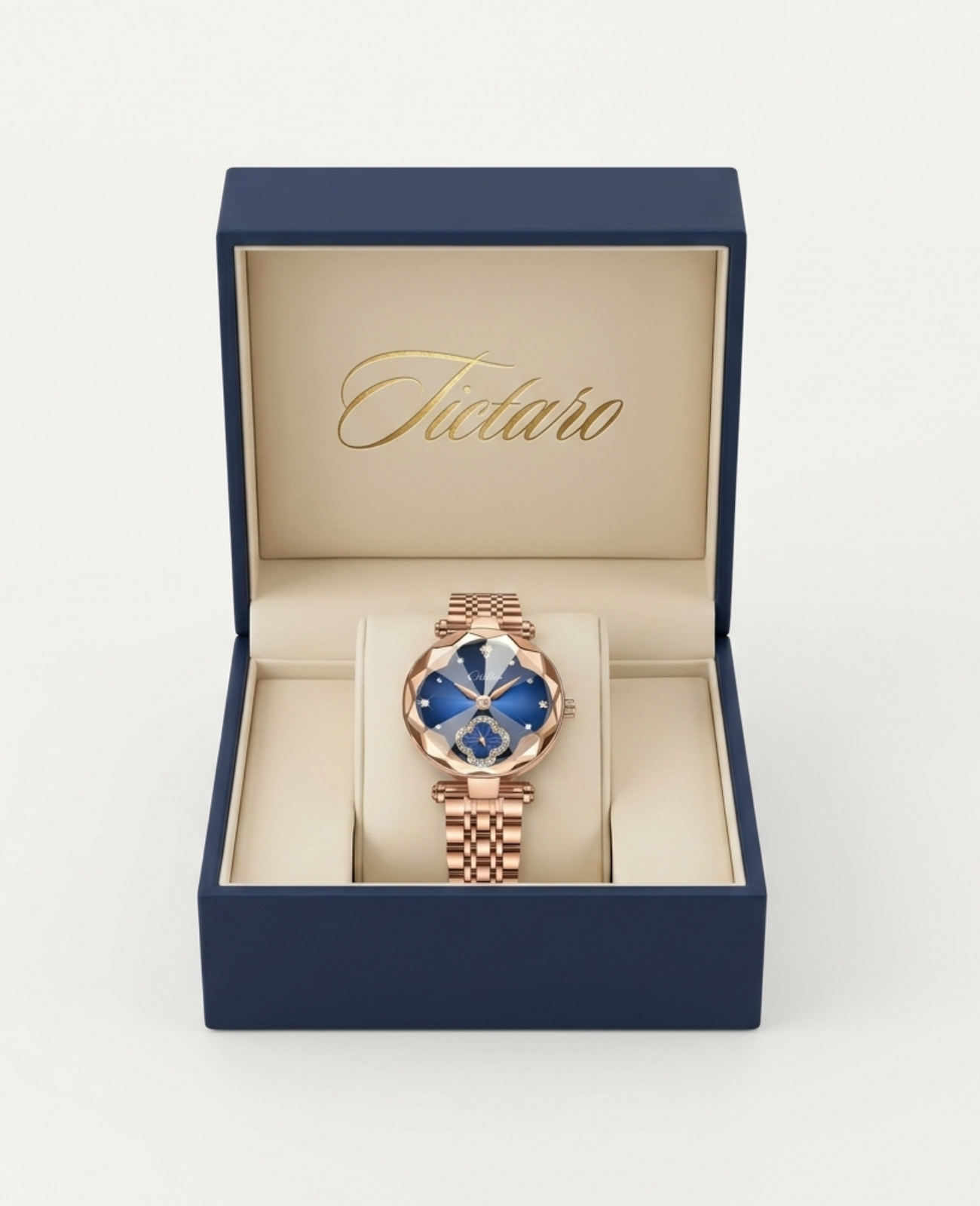 The faceted crystal-inspired case and polished rose gold finish give this timepiece a luminous and feminine presence. Its refined silhouette sits gracefully on the wrist, offering a perfect balance of sophistication and glamour. The elegant bracelet, enhanced with sparkling accents, elevates its luxurious appeal while ensuring comfort and durability — a watch designed to shine beautifully through every occasion.