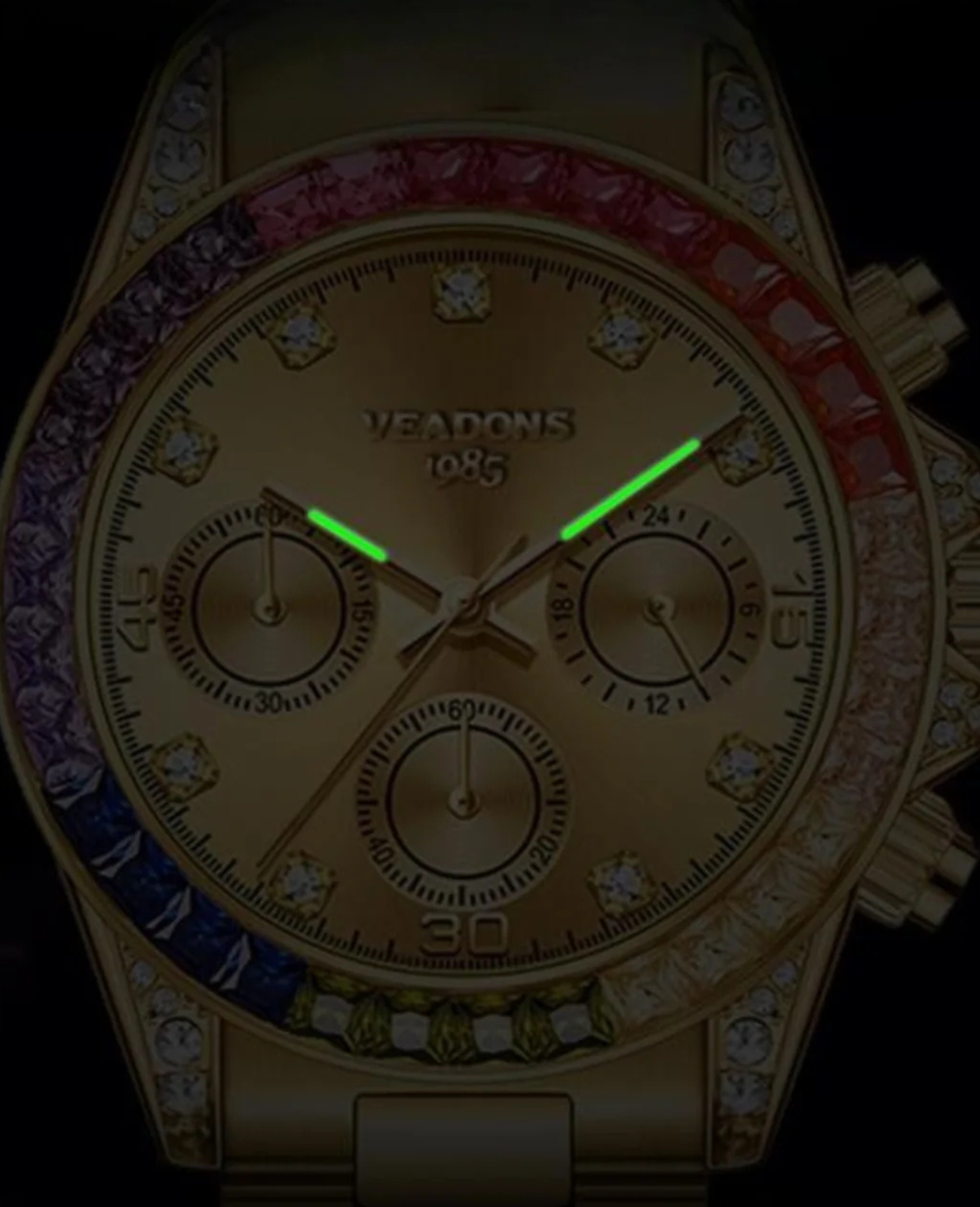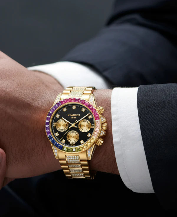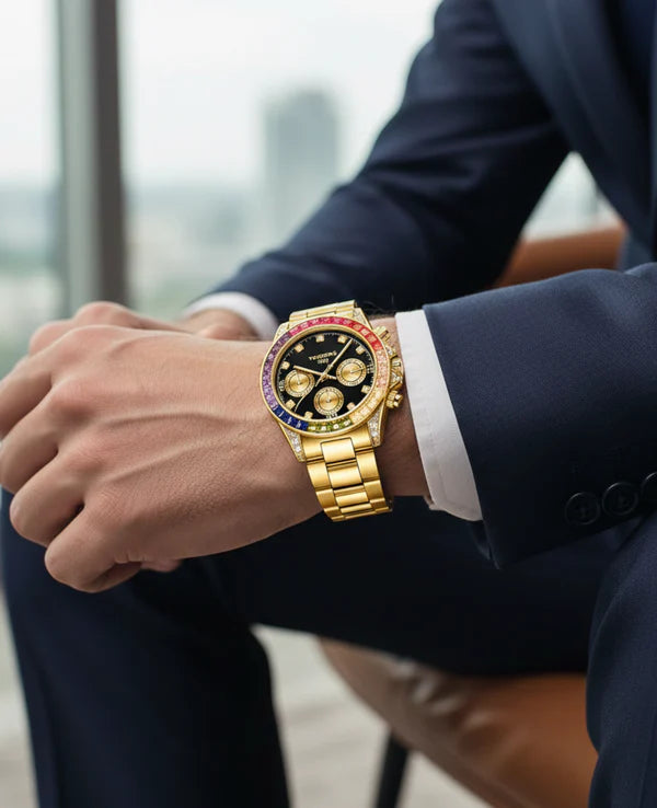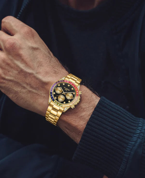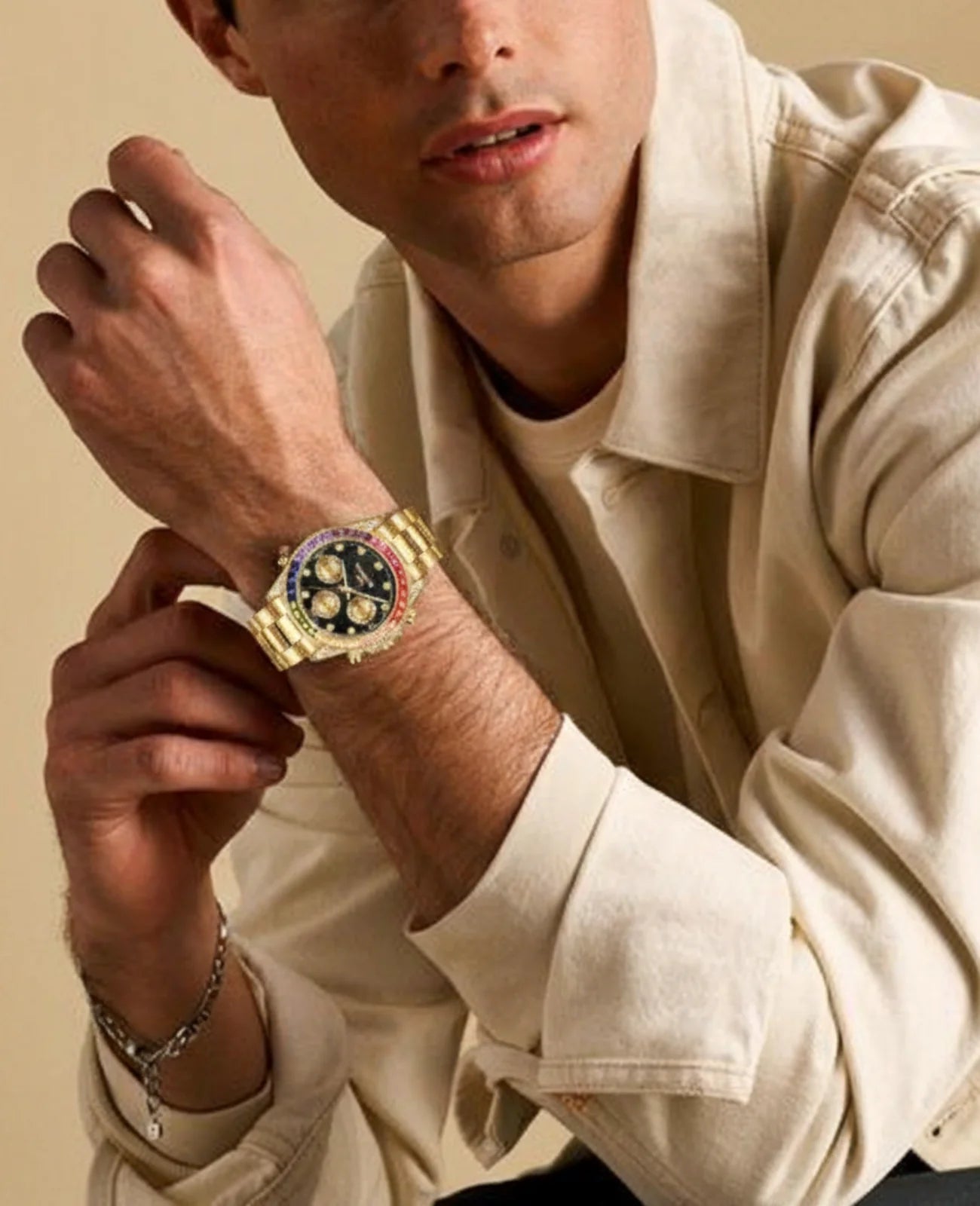 Make a powerful statement with this premium gold timepiece, crafted for men who aren’t afraid to stand out. Featuring a dynamic chronograph layout, precision quartz movement, and a vibrant multi-tone gemstone bezel, it blends sport-inspired performance with elevated sophistication. The polished gold-tone stainless steel construction delivers durability and presence, while the detailed dial and luminous accents ensure both function and flair. Designed to command attention — whether at an event, a night out, or making everyday moments unforgettable.
