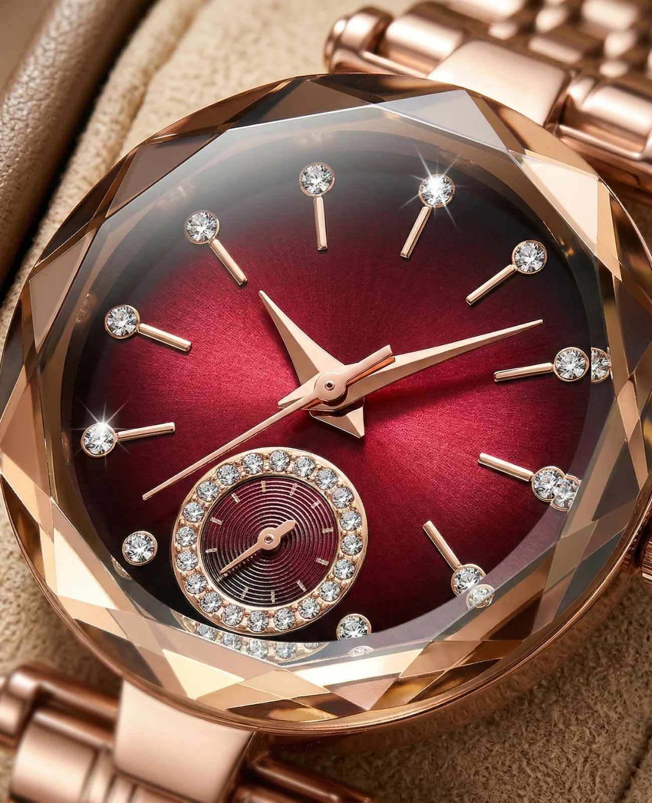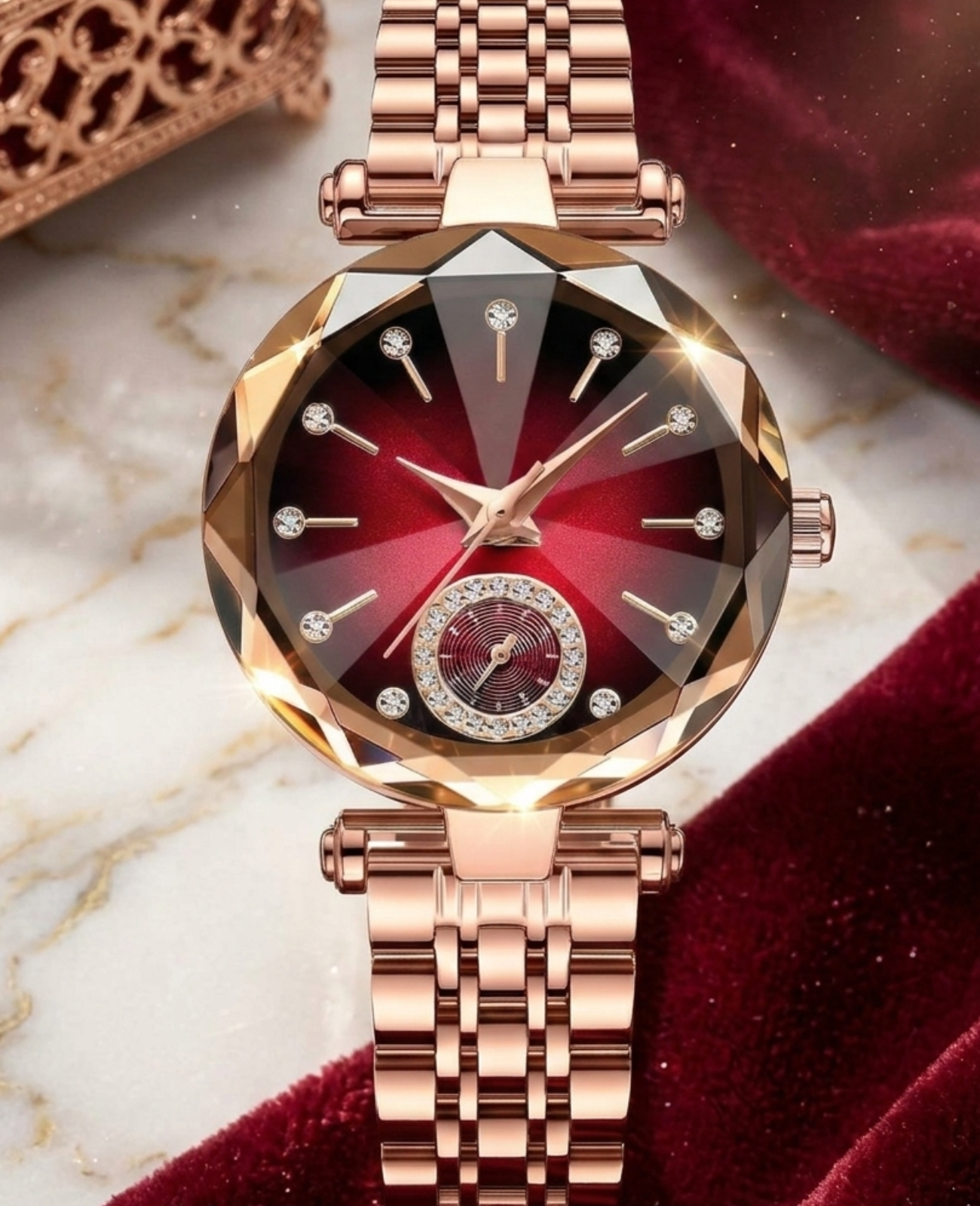 Elevate your style with this exquisite rose gold timepiece, designed for women who love to shine with sophistication. Featuring a faceted crystal-inspired case, a deep sunburst dial with sparkling hour markers, and a delicate moonphase detail, it blends glamour with graceful precision. The polished rose gold bracelet and crystal accents enhance its luxurious appeal, making it the perfect accessory for both everyday elegance and special occasions. A watch designed to capture attention — and hearts — wherever you go.